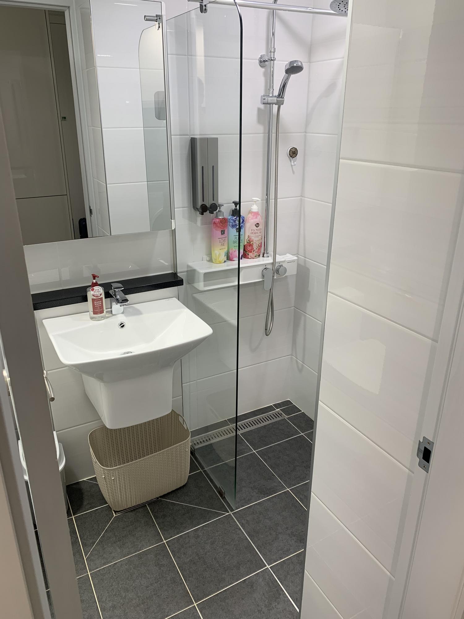 Гармонично корзину для вещей на стирку расположили под раковиной.